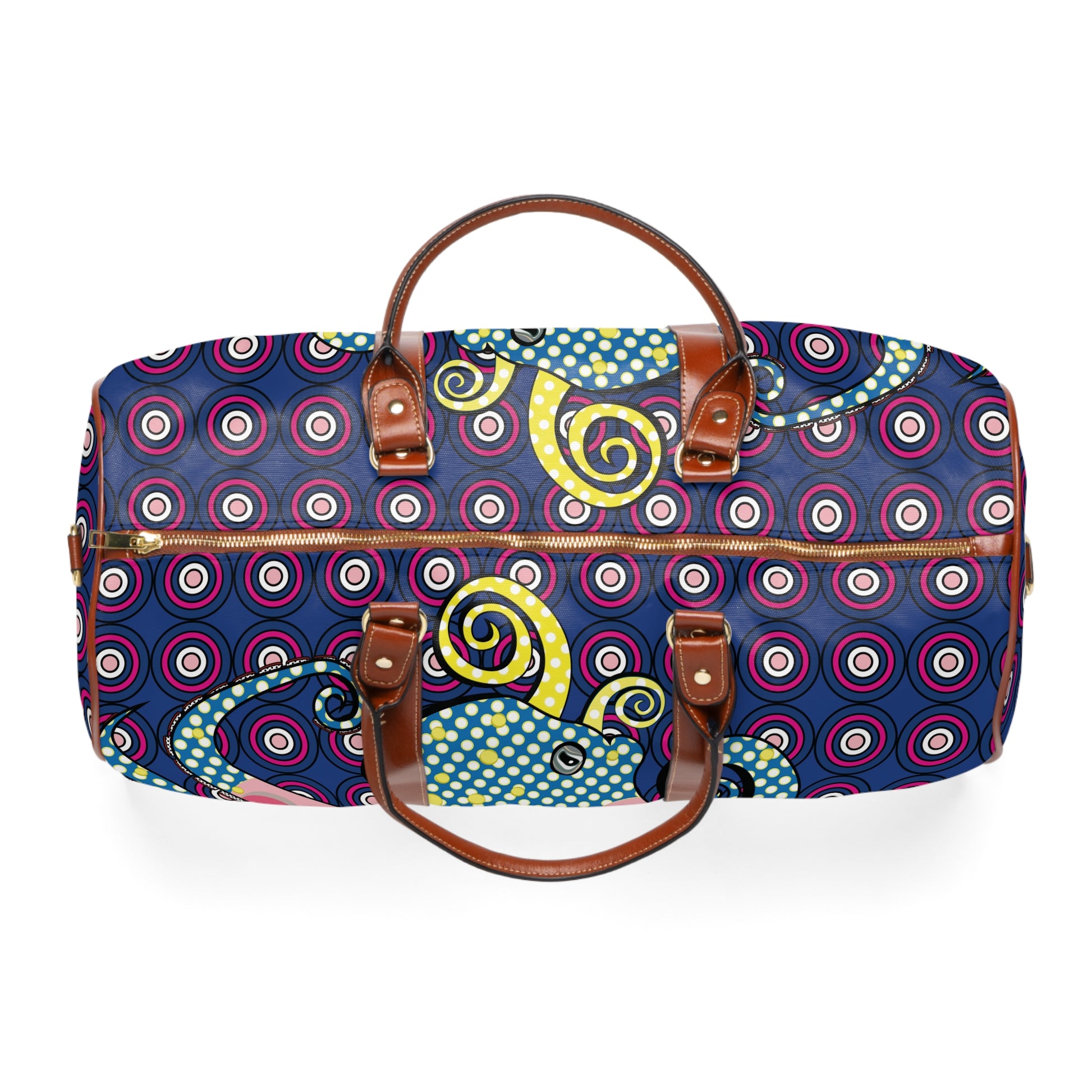 Bright, splashy, and built to move with you — this travel bag turns every trip into a little adventure. The bold octopus print pops against a retro circular pattern, bringing a playful, oceanic vibe to weekend escapes and city-hop getaways. Lightweight yet rugged, it holds its shape while stowing clothes, toiletries, and the extras you reach for last minute. The brown PU handles and adjustable shoulder strap give a classic travel silhouette, while gold-toned hardware and a neat inner pocket keep things organized and easy to access. Carry it to the coast, the studio, or the overnight train and let the color do the talking.
